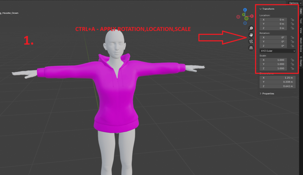 1.1.Put hoodie on the body so it fits, then hit CTRL+A and apply location, scale, rotation/do not apply “all transformations” option/ so it apply at 0,0,0 as shown on right side panel
