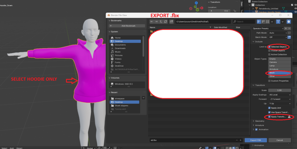 2.Click on hoodie, then Export as .fbx and selcet settings as I highlighted