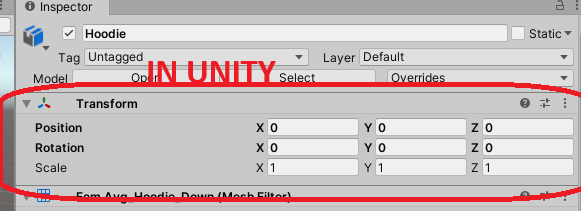 3.Import hoodie into Unity, drag and drop into Hierarchy panel and you should see this :